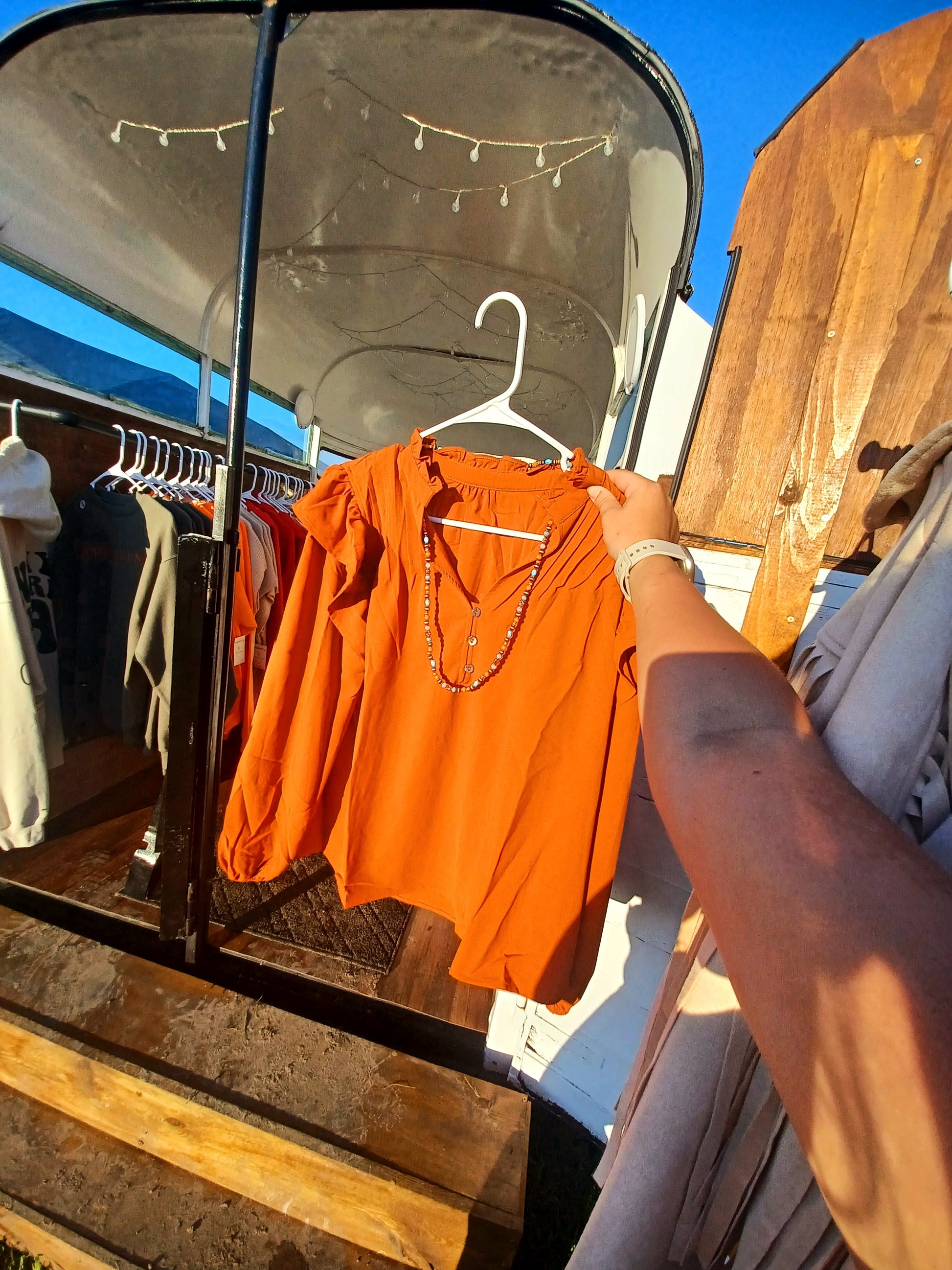 Bri is a gorgeous rust blouse that is perfect for special occasions! Bri features ruffle and pleated detailing around the collarbone and shoulder area. This blouse isn't too tight or too loose.